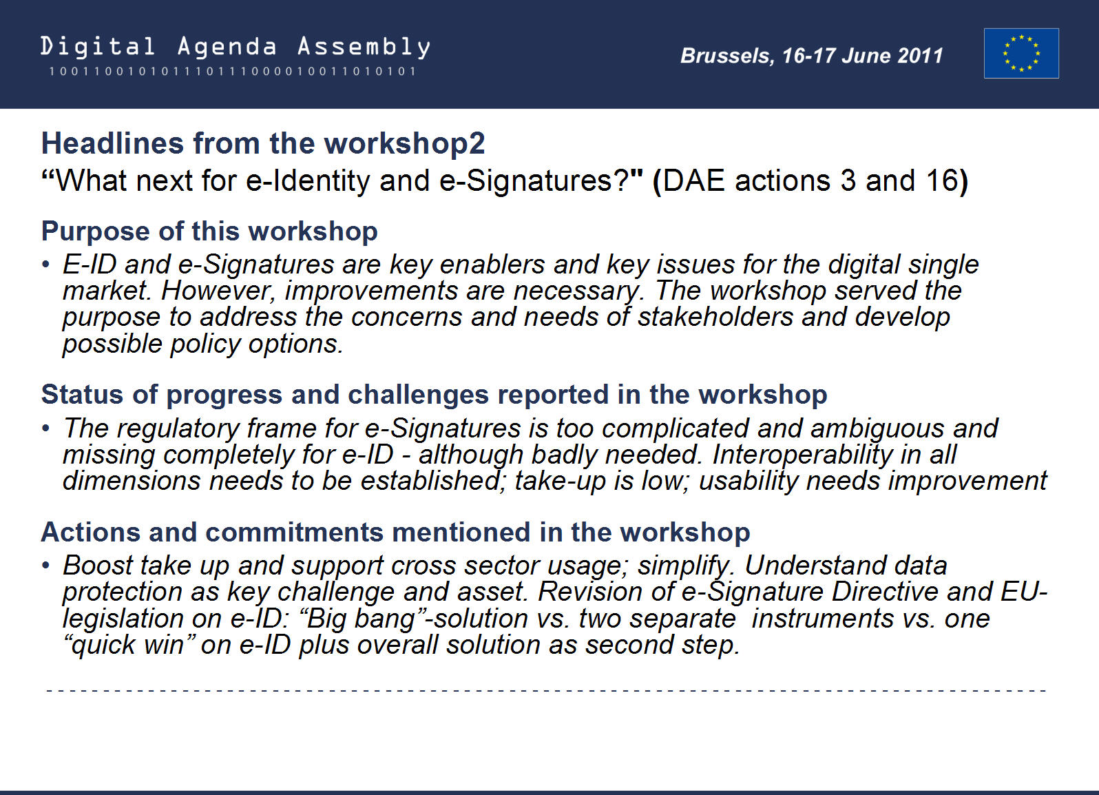 Electronic identification and eSignatures are key assets for the digital single market. Live demos of pilots developed by Large Scale Pilots STORK, PEPPOL and SPOCS will kick off the brainstorming on how eID and eSignatures can be used in practice throughout Europe and for different areas. The feedback from the audience on their usability and missing aspects will introduce the first session dedicated to the citizen/consumer and business perspective. From the business' point of view take up of eID and eSignatures is one of the core issues to be discussed. eID key aspects such as the cross-border and cross-sector use, liability and the free access to authentication need to be considered. The identification of stumbling blocks to mutual recognition of eIDs across Europe should help both, to fill current gaps and to analyse the elements needed to ensure their EU-wide use. The question whether all citizens should have a right to have an eID issued and possible alternatives will be also a topic. Policy options for eID and eSignatures will be discussed in session 2. Representatives of European institutions will have their say on possible legislative measures to ensure trust, security and data protection. Benefits for the civil society and challenges to be faced need also to be addressed. Legislative measures have to take into account also of the local dimension for which a right balance have to be found between a bottom up and top down approach. At discussion will be also data protection - for some perceived as a barrier for eID and eSignatures for others an asset.