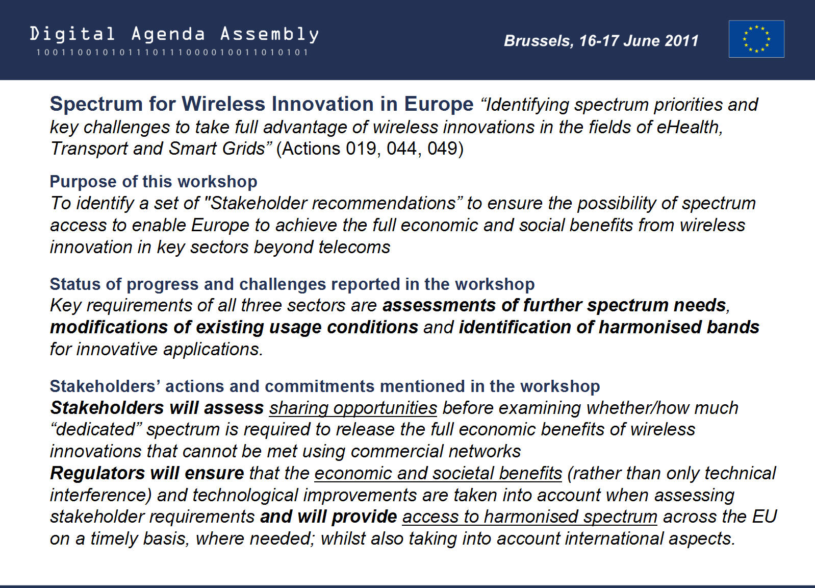 In this workshop Digital Agenda stakeholders will discuss with key European spectrum policy makers what is needed to take full advantage of wireless innovation in Europe.