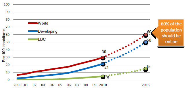 By 2015, Internet user penetration should reach 60% worldwide, 50% in developing countries and 15% in LDCs.