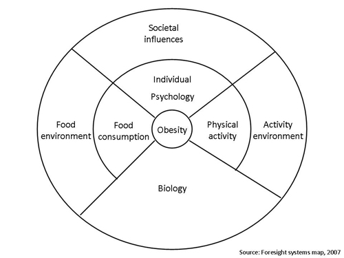The Foresight report [2] refers to a “complex web of societal and biological factors that have, in recent decades, exposed our inherent human vulnerability to weight gain”, and presents an obesity system map (above) with energy balance at its centre and over 100 variables directly or indirectly influencing this energy balance; grouped in 7 cross-cutting themes (below):