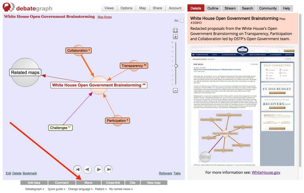 Map creators and moderators can also use the Move button to merge two (or more) maps by moving the Map home idea for one map onto the intended target map (using the Move button in the usual way). Merging map A into map B combines the content, communities and links etc of the two maps into Map B (and removes Map A).