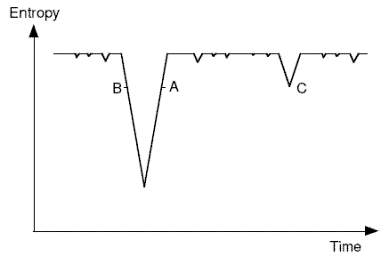 | Boltzmann-Schuetz hypothesis Opinion1 #104155 Boltzmann and Schuetz claimed that in a universe that is near thermal equilibrium, and given sufficient time, there will be regions where there is a temporary deviation into a low entropy state, from which it will trend back to equilibrium. Anthropic selection accounts for us being in such a region. | Boltzmann suggested this explanation in a letter to Nature in 1895 - he attributes the idea 'to my old assistant Dr Schuetz'. The basic idea is depicted in the following diagram. The downward spikes represent low-entropy occurrences, with the system in the high entropy state most of the time. We are presumed to be at some position like A or B - the slope doesn't matter (case C is discussed elsewhere).  Note that in the passage cited below Boltzmann presumes that the thermodynamic arrow determines the psychological arrow of time. This issue is explored elsewhere in the map (follow cross-link). |