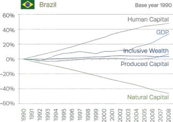 Brazil and India case studies☜Between 1990 and 2008, the wealth of Brazil and India (in terms of GDP per capita) rose 34% and 120% respectively. But when measures of natural, human and manufactured capital are considered together to obtain a more comprehensive value, Brazil’s “Inclusive Wealth” rose just 3% and India’s rose 9%.☜FFFACD