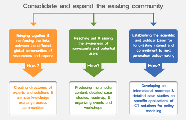 • Establishing the scientific and political basis for long-lasting interest and commitment to next generation policy-making, beyond the mere availability of FP7 funding: it will focus on use cases and a demand-driven approach, involving policy-makers and advisors in high-level conference, defining a collaborative stakeholders' declaration and developing a sustainability plan.