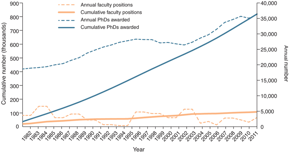 | 5. Few postdocs have realistic prospects of a regular faculty position Opinion1 #290417 The postdoc population, which has grown very rapidly in U.S. universities and is recruited increasingly from abroad, looks more like a pool of low-cost research lab workers with limited career prospects than a high-quality training program for soon-to-be academic researchers. Indeed, if the truth be told---only a very small percentage of those in the current postdoc pool have any realistic prospects of gaining a regular faculty position. | New faculty positions versus new PhDs  Source: Nature Biotechnology 31, 938–941 (2013) doi:10.1038/nbt.2706 "Since 1982, almost 800,000 PhDs were awarded in science and engineering (S&E) fields, whereas only about 100,000 academic faculty positions were created in those fields within the same time frame. The number of S&E PhDs awarded annually has also increased over this time frame, from ~19,000 in 1982 to ~36,000 in 2011. The number of faculty positions created each year, however, has not changed, with roughly 3,000 new positions created annually." |