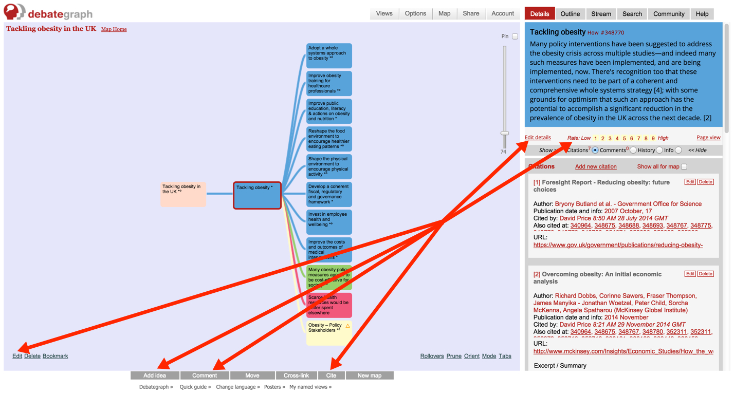(5) Edit an existing idea using the Edit link (bottom left on the map) or the Edit details link (at the bottom left of the Details text area, on the right of the screen). Each idea has a full Edit history; so you can always revert to an earlier version of the idea at any time.